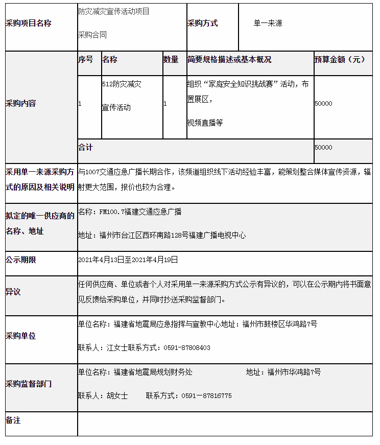 應急指揮與宣教中心防災減災宣傳活動項目單一來源采購公示