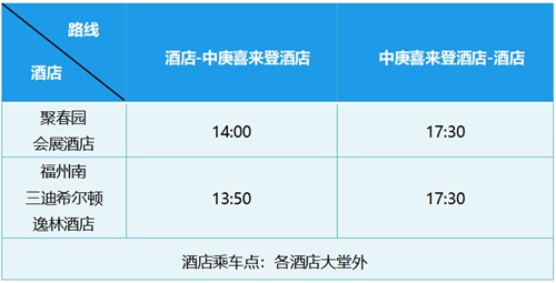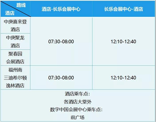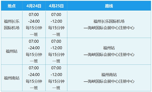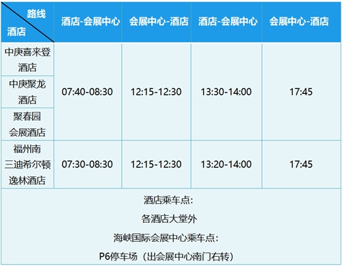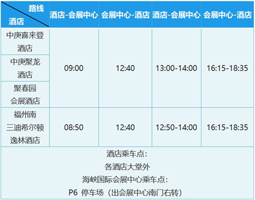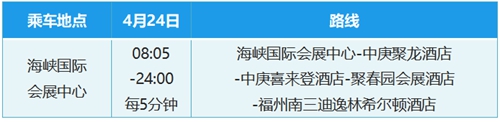 3.3 會間接駁 4月25日至4月26日,為保障參會嘉賓按時參會,將安排各指定酒店至會場的定點往返班車。 ● 4月25日海峽國際會展中心接駁安排