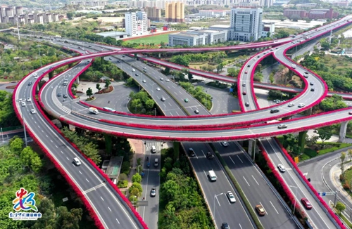 池遠 攝 在福州的高架、大橋等關鍵路段 盛放的三角梅為道路鑲上了紅色“花邊” 長達158公里的“紅緞帶” 在路邊熱情地歡迎著八方賓客