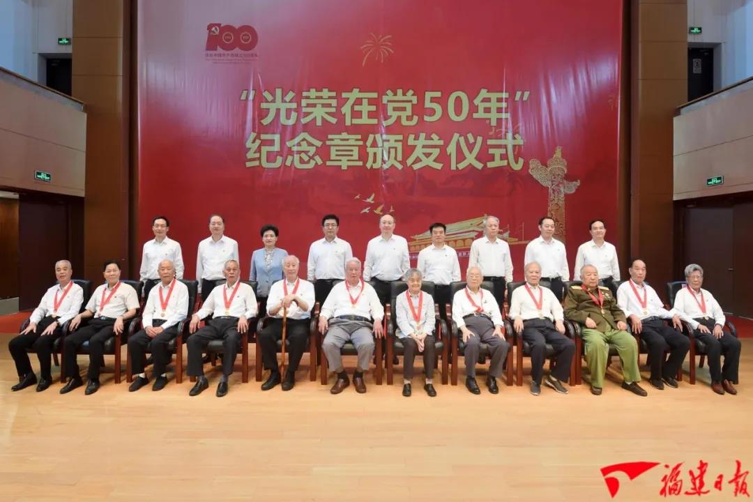 6月23日,福建省委舉行“光榮在黨50年”紀念章頒發儀式,向部分在榕老黨員頒授紀念章。省委書記尹力代表省委向老黨員表示熱烈祝賀,向大家長期以來為福建發展作出的重要貢獻表示衷心感謝,并通過他們向全省廣大老黨員致以親切問候和崇高敬意。