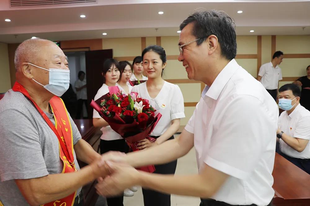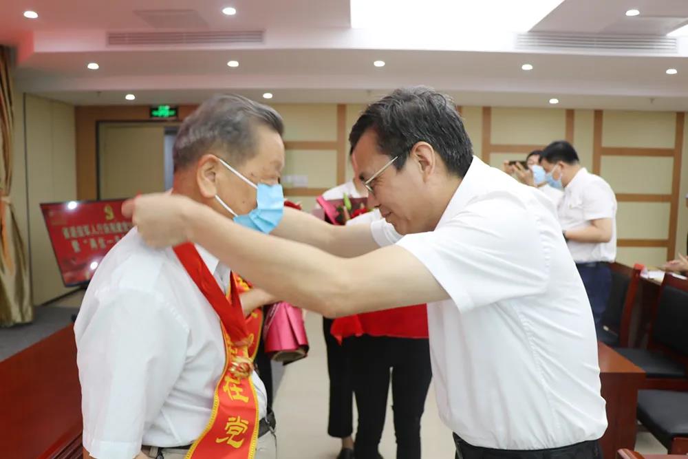 伍斌為所屬單位兩位黨齡超過50年的退休老黨員許世農(nóng)、吳啟文頒發(fā)“光榮在黨50年”紀念章。