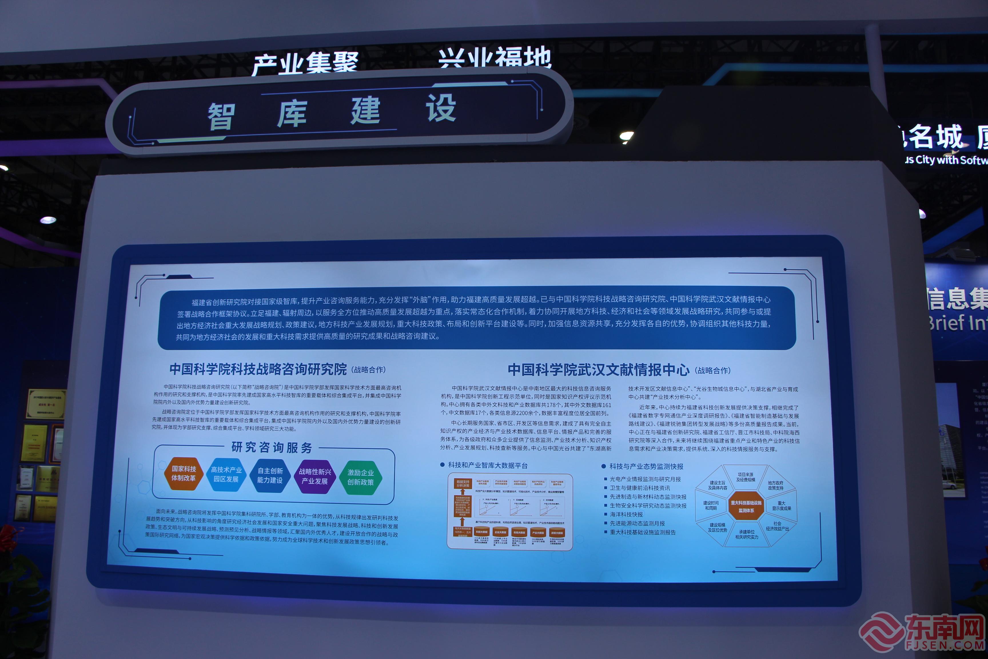 省創(chuàng)新研究院展區(qū) 東南網(wǎng)記者盧金福 攝 智庫建設(shè)板塊:展示智庫建設(shè)情況,省創(chuàng)新研究院對(duì)接國(guó)家級(jí)智庫,提升產(chǎn)業(yè)咨詢服務(wù)能力,充分發(fā)揮“外腦”作用,助力福建高質(zhì)量發(fā)展超越。