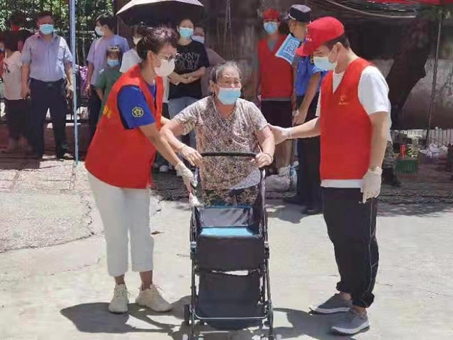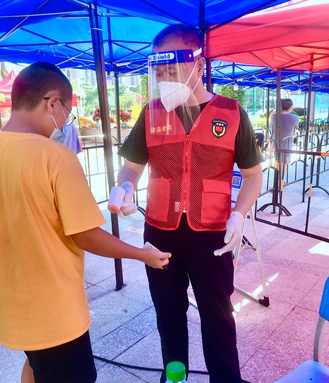 退役軍人游文晃到一線與社區工作者共同防抗疫情。廈門市退役軍人服務中心供圖 |