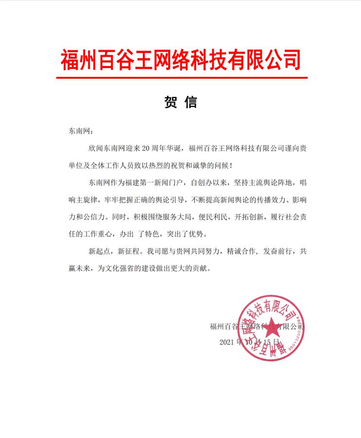 福州白谷王網絡科技有限公司賀信