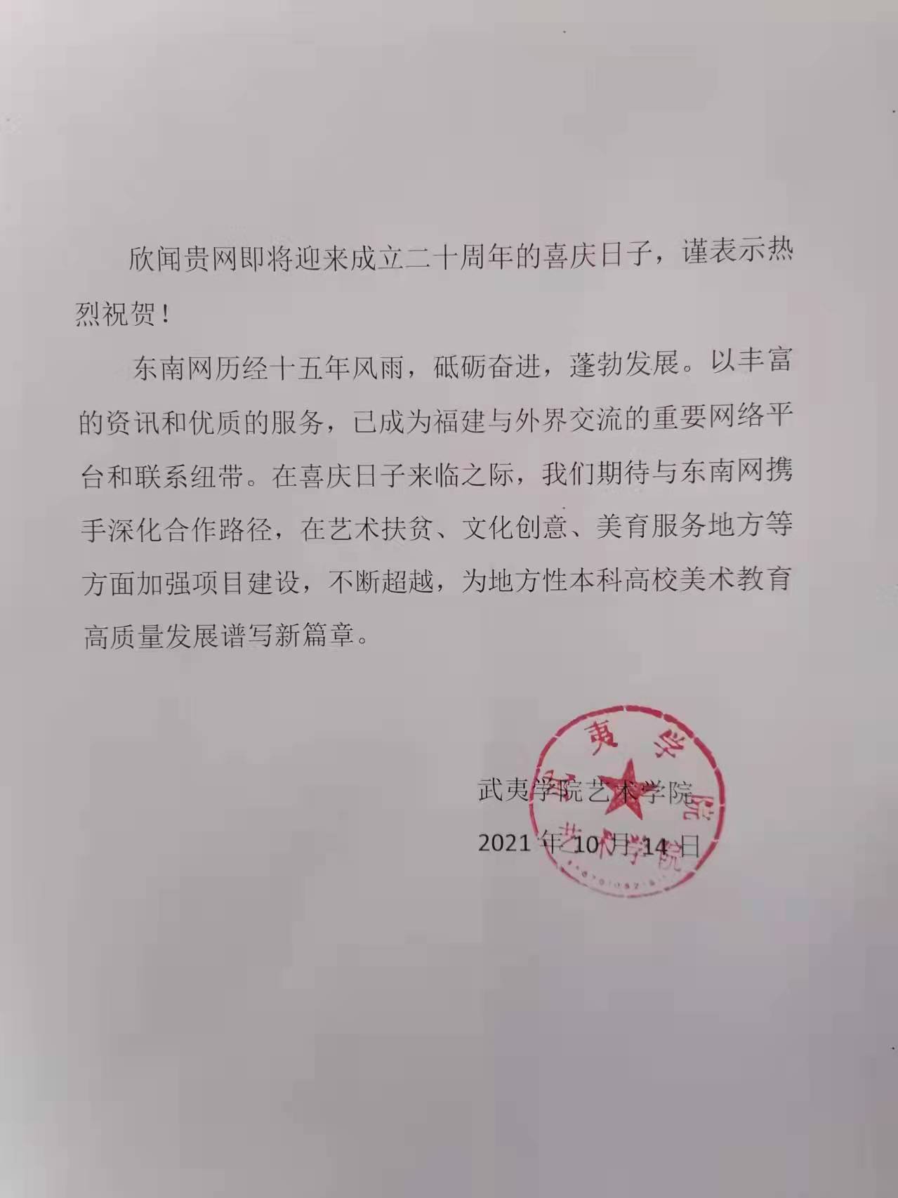 武夷學院藝術學院賀信