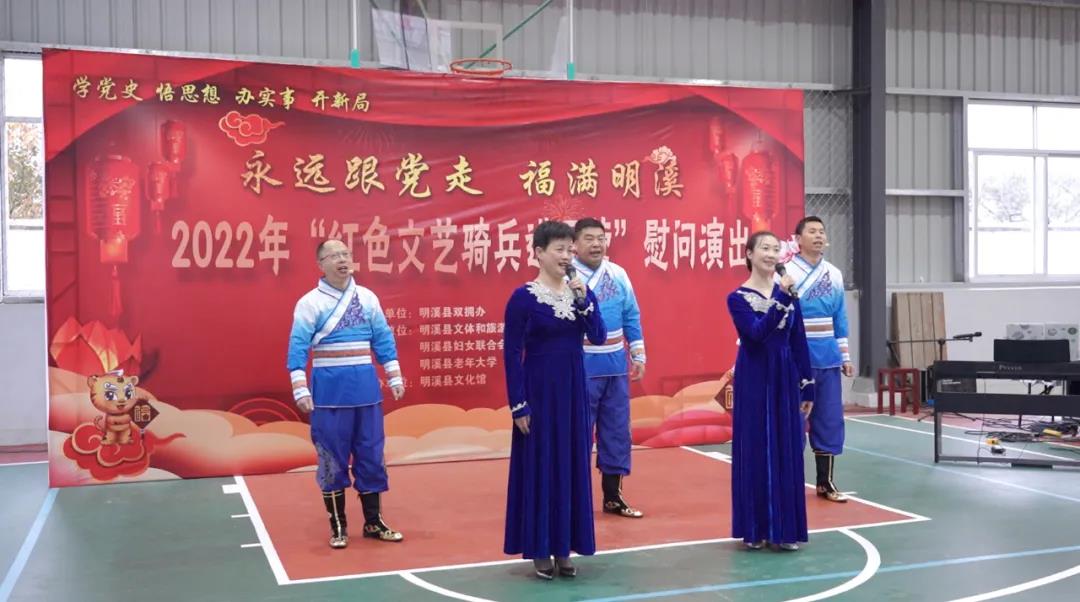 1月22日,由三明市明溪縣雙擁辦、縣委宣傳部主辦,縣文旅局、縣退役軍人事務(wù)局、縣婦聯(lián)、縣文聯(lián)、縣老年大學(xué)協(xié)辦的“永遠(yuǎn)跟黨走·福滿明溪”2022年“紅色文藝騎兵進(jìn)軍營”慰問演出在明溪縣武警中隊訓(xùn)練館成功舉辦。