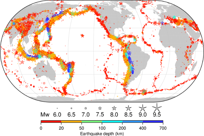 國際地震中心2020年4月發布的1904-2016年全球Mw6.0地震分布圖 自1907年有關發現深源地震的觀測結果發表后,就受到廣泛質疑,直至和達清夫通過研究證實了深源地震的存在,以及貝尼奧夫綜合地質、地震和物理信息提出貝尼奧夫帶(現稱Wadati-Benioff帶,即俯沖帶)來解釋深震活動圖像,深震作為一種“不可思議”的現象始得到較廣泛研究。近百年的觀測研究表明:天然發生的深震與淺震都屬于構造地震,是人類生存的地球深部鮮活運轉著的體現。