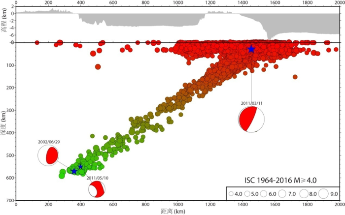 中國科學院地質與地球物理研究所 陳棋福 云南省地震局 姜金鐘 2002年6月29日1時19分,我國吉林省汪清縣發生7.2級深震,震源深度540 km。該震與7級淺源地震激發的地震能量和震動波形基本一致,在經過數百至上千千米的能量衰減后,到達東北全境和華北部分地區時雖仍有微小震動,但并未驚醒位于該震上方的汪清周邊居民。與7級淺源地震常常造成大量人員傷亡和重大經濟損失相比,汪清深震未造成人員傷亡和建筑物破壞。 一、汪清7.2級深震發生的位置 深震是指震源深度大于70 km(也有認為是大于60 km),深度小于70 km或60 km的則稱為淺震(淺源地震),深度在70~300 km或60~300 km的地震被稱為中源地震,深度大于300 km的為深源地震。中源地震和深源地震經常被籠統的稱為深震,有些嚴格的學者則僅將深度大于300 km的地震稱為深震? 從下圖看,汪清深震發生在太平洋板塊俯沖至中國東北下方的日本俯沖帶上,中國東北一帶的深震活動可以從近600 km的深處連續向上和向東追蹤至日本海溝附近的淺源地震,十分明顯地展現出太平洋板塊向歐亞大陸板塊俯沖插入中國東北大陸下方約600 km深度的圖像。各種尺度的地震層析成像結果也都顯示中國東北一帶的深源地震與日本海深震具有很好的連續性并發生在西太平洋俯沖板片的高速異常體內部。圖中藍色星號處及其連線分別給出了汪清7.2級深震的位置和震源機制解。