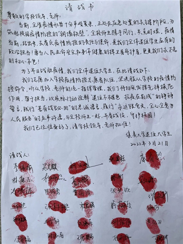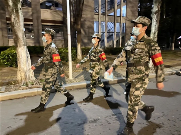 一封請戰書 包含的不僅是 始終堅守的職責 更是逆風前行的無畏 “請戰書”中的一字一句 蘊藏著鼓舞人心的巨大力量 勇敢的年輕戰士們 第一時間響應 投身抗疫一線 校內巡邏 彰顯擔當