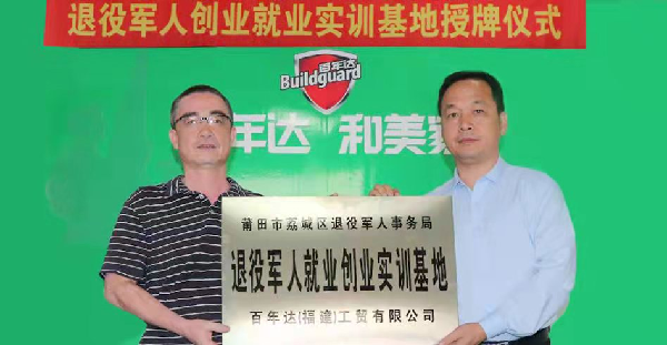 追夢路上,軍旅情懷一路伴跑 張志芳對部隊一直有著深厚的感情,百年達也始終把退役軍人放在突出位置,積極扶持退役軍人就業創業。公司現有退役軍人員工26人,其中副團職自主擇業退役軍官3人,扶持退役軍人創業28人,安排退役軍人就業300多人,在現有幾十位退伍軍人經銷商、員工的基礎上,還在繼續壯大退役軍人團隊,公司所有崗位招聘時優先錄用退役軍人。對創業的退役軍人在政策上和經濟上給予大力扶助,長年全程免費技術培訓,全國300多家代理專賣店,其中公司特殊扶持的退役軍人創業代理店占三分之一。企業完善獨特軍旅企業文化,設有退役軍人之家,定期組織員工進行基本軍事訓練,開展愛黨、愛國、擁軍教育活動。 2020年6月,公司獲“退役軍人創業創新大賽一等獎”,張志芳個人獲得全國退役軍人創業先鋒稱號,受聘為福建省退役軍人事務廳創業導師團成員。2020年11月,公司作為當地政府“退役軍人就業創業實訓基地”,在退役軍人就業創業事業上承載了更多更遠的夢想。 |