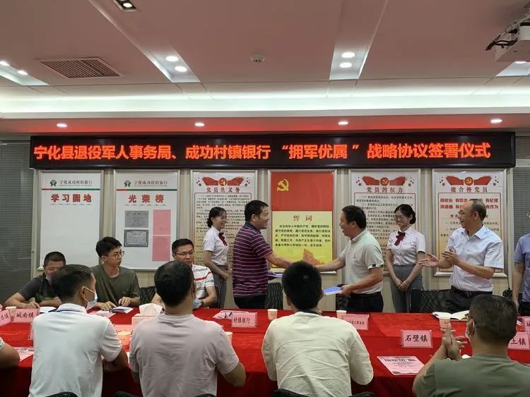 9月16日,寧化縣退役軍人事務局與成功村鎮銀行簽署擁軍優屬戰略合作協議,共同探索新時代社會化擁軍優撫工作的新模式、新路子,為廣大退役軍人及優撫對象提供更好的優待服務。寧化縣退役軍人事務局局長范鵬舉、成功村鎮銀行董事長馬先輝、各鄉(鎮)退役軍人服務站負責人等出席儀式。
