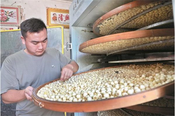 烈日下,他頭戴一頂遮陽帽,忙完了村里的事,又穿梭在白蓮加工車間和羊圈之間忙碌,整天忙得像個旋轉的陀螺。