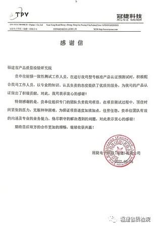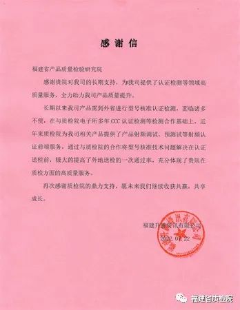 截至目前,福建省質檢院電子所依托新獲資質能力,已為我省及周邊企業提供了多批次的5G CCC認證以及BT/Wi-Fi型號核準預測試等新領域的檢測服務,幫助企業在家門口即可得到及時高效服務,進一步縮短了企業認證周期,受到多家企業的一致好評,獲贈多封感謝信。 |