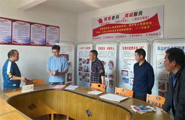 李日偉(左二)到鶴塘鎮(zhèn)溪邊村指導(dǎo)村級(jí)退役軍人服務(wù)站建設(shè)