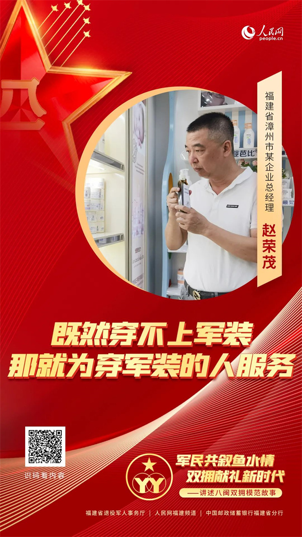 “軍愛民、民擁軍,軍民魚水一家親?!备=?,是全國唯一所有設區市連續五屆獲評雙擁模范城(縣)的省份,一個個軍愛民、民擁軍的生動故事在八閩大地不斷涌現。為唱響閩山閩水間的“愛我人民愛我軍”軍民情主旋律,福建省退役軍人事務廳聯合人民網福建頻道、中國郵政儲蓄銀行福建省分行共同推出“軍民共敘魚水情 雙擁獻禮新時代”主題宣傳活動,從“新時代八閩雙擁故事”看福建如何續寫新征程上的雙擁新篇章。 本期嘉賓:福建省漳州市某企業總經理趙榮茂