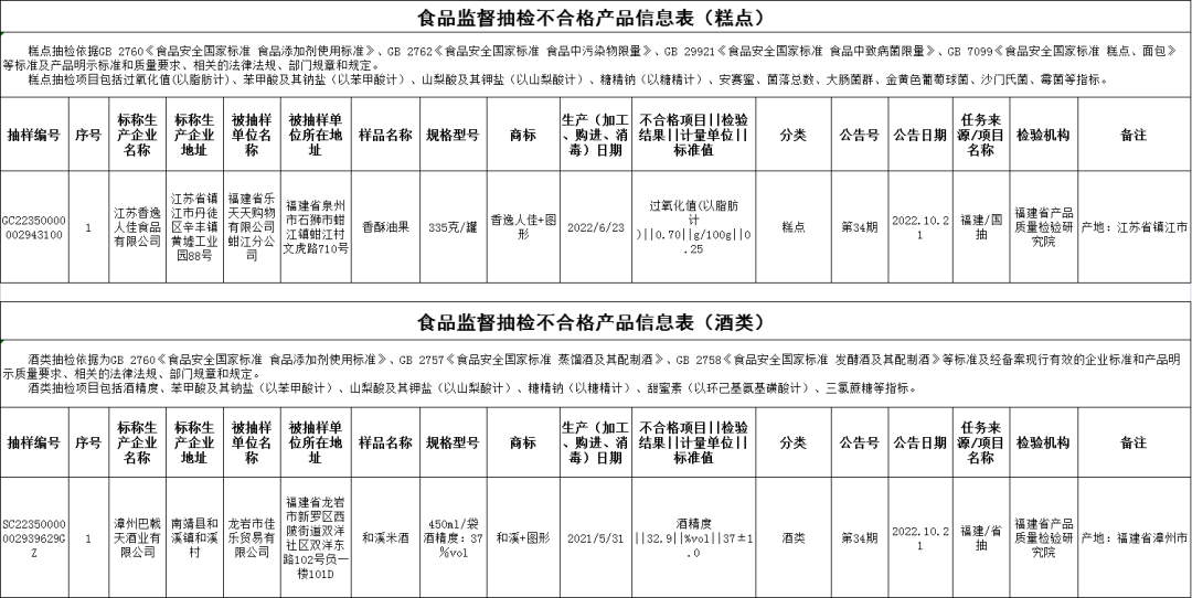 質量指標問題:江蘇香逸人佳食品有限公司2022年6月23日生產的香酥油果,過氧化值(以脂肪計)不合格,銷售單位為福建省樂天天購物有限公司蚶江分公司,檢驗機構為福建省產品質量檢驗研究院;漳州巴戟天酒業有限公司2021年5月31日生產的和溪米酒,酒精度不合格,銷售單位為龍巖市佳樂貿易有限公司,檢驗機構為福建省產品質量檢驗研究院。