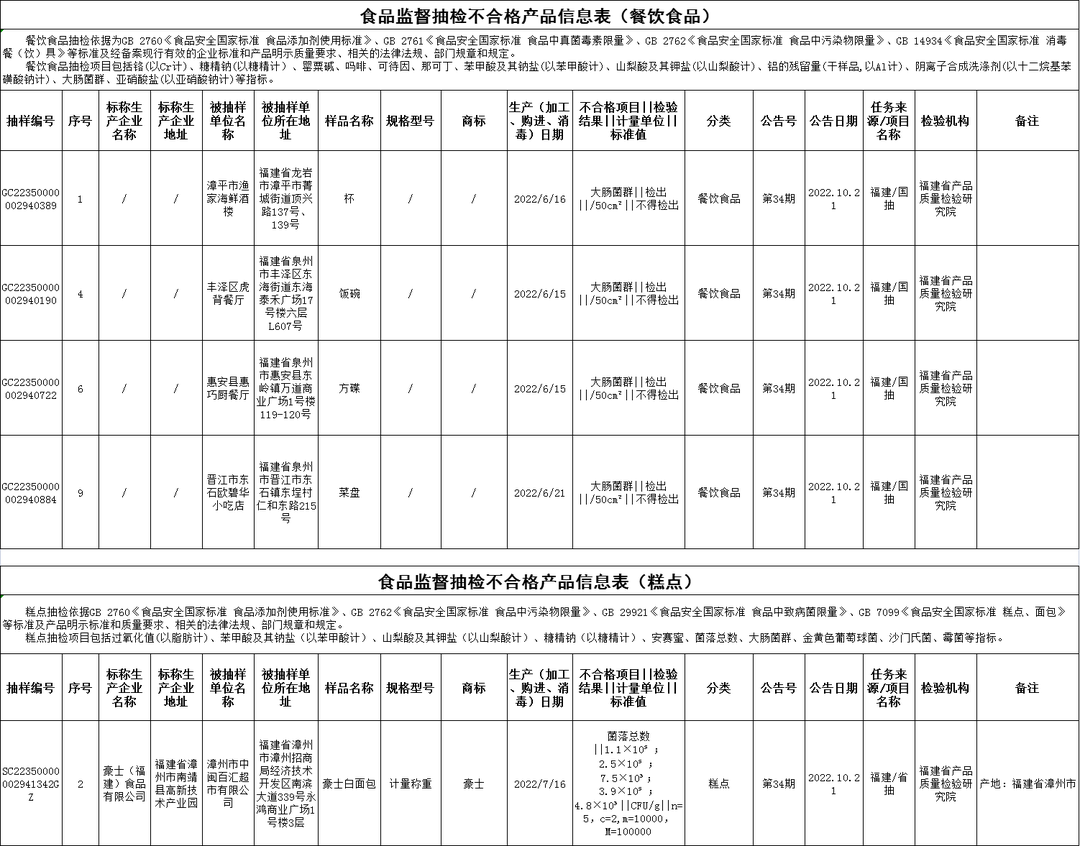 福建第34期監督抽檢結果:22批次食品抽檢不合格!