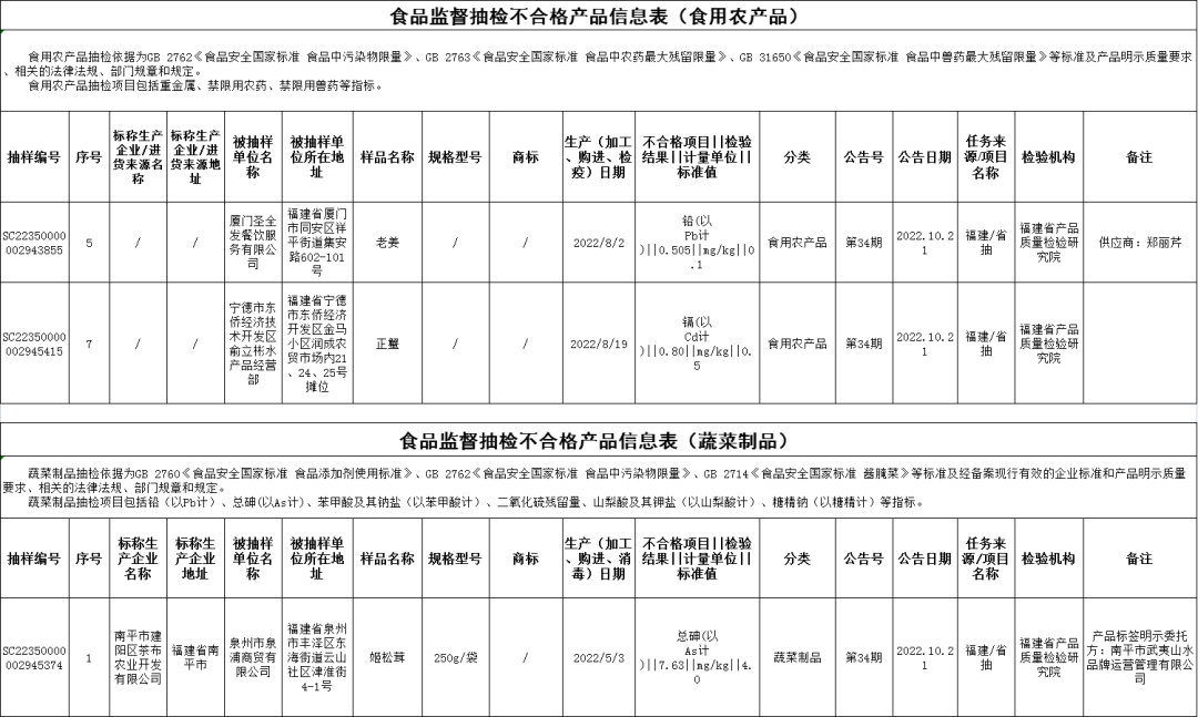 重金屬污染問題:廈門圣全發餐飲服務有限公司銷售的老姜(購進日期為2022年8月2日),鉛(以Pb計)不合格,檢驗機構為福建省產品質量檢驗研究院;寧德市東僑經濟技術開發區俞立彬水產品經營部銷售的正蟹(購進日期為2022年8月19日),鎘(以Cd計)不合格,檢驗機構為福建省產品質量檢驗研究院;南平市建陽區茶布農業開發有限公司2022年5月3日生產的姬松茸,總砷(以As計)不合格,銷售單位為泉州市泉浦商貿有限公司,檢驗機構為福建省產品質量檢驗研究院。