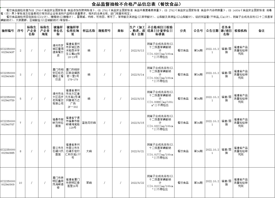 其他污染問題:漳州市薌城區壹周速食餐飲店的碗(消毒日期為2022年6月13日),陰離子合成洗滌劑(以十二烷基苯磺酸鈉計)不合格,檢驗機構為福建省產品質量檢驗研究院;廈門市翔安區旺巴蜀旺江餐飲店的碗(消毒日期為2022年6月14日),陰離子合成洗滌劑(以十二烷基苯磺酸鈉計)不合格,檢驗機構為福建省產品質量檢驗研究院;漳州市龍文區百歲老媽餐飲有限公司的碗(消毒日期為2022年6月15日),陰離子合成洗滌劑(以十二烷基苯磺酸鈉計)不合格,檢驗機構為福建省產品質量檢驗研究院;福鼎市前岐馬林拉面館的藍色花紋碗(消毒日期為2022年6月15日),陰離子合成洗滌劑(以十二烷基苯磺酸鈉計)不合格,檢驗機構為福建省產品質量檢驗研究院;晉江市東石鎮川氏面館的大碗(消毒日期為2022年6月21日),陰離子合成洗滌劑(以十二烷基苯磺酸鈉計)不合格,檢驗機構為福建省產品質量檢驗研究院;廈門市思明區鑫阿鳳海鮮酒樓的菜碗(消毒日期為2022年6月22日),陰離子合成洗滌劑(以十二烷基苯磺酸鈉計)不合格,檢驗機構為福建省產品質量檢驗研究院。