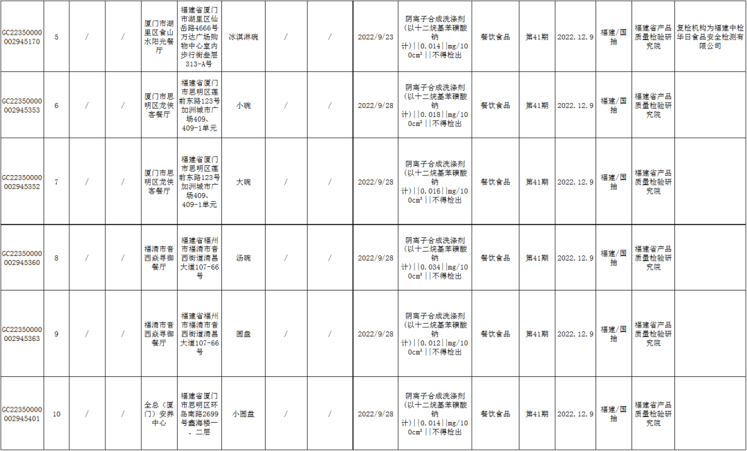 微生物污染問題 晉江尚白餐飲有限公司的三文魚(加工日期為2022年10月10日),菌落總數(shù)不合格、大腸菌群不合格,檢驗機構(gòu)為廈門泓益檢測有限公司; 福州市晉安區(qū)源順餐飲店的復(fù)用瓷杯(消毒日期為2022年10月8日),大腸菌群不合格,檢驗機構(gòu)為福州海關(guān)技術(shù)中心; 福清市音西榕豐餐廳的飯碗(消毒日期為2022年9月29日),大腸菌群不合格,檢驗機構(gòu)為福建省產(chǎn)品質(zhì)量檢驗研究院; 福清市音西榕豐餐廳的湯碗(消毒日期為2022年9月29日),大腸菌群不合格,檢驗機構(gòu)為福建省產(chǎn)品質(zhì)量檢驗研究院; 廈門市丫滿意女王餐飲管理有限公司的小碗(消毒日期為2022年10月13日),陰離子合成洗滌劑(以十二烷基苯磺酸鈉計)不合格、大腸菌群不合格,檢驗機構(gòu)為福建省產(chǎn)品質(zhì)量檢驗研究院; 標稱寧德市福林水產(chǎn)有限公司2022年8月9日生產(chǎn)的即食海蜇,菌落總數(shù)不合格,銷售單位為寧德鑫永濤超市有限公司,檢驗機構(gòu)為福建賽福食品檢測研究所有限公司。