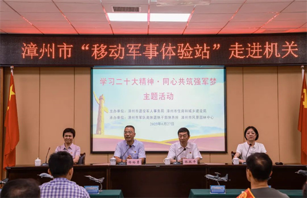 “學(xué)習(xí)二十大精神,同心共筑強(qiáng)軍夢”。6月27日,漳州市“移動(dòng)軍事體驗(yàn)站”首次走進(jìn)漳州市風(fēng)景園林中心,面向機(jī)關(guān)干部職工開展國防教育。以此紀(jì)念延安雙擁運(yùn)動(dòng)80周年,推動(dòng)全民國防教育走深走實(shí)。漳州市住建局、漳州市風(fēng)景園林中心50余人參加活動(dòng),漳州市退役軍人事務(wù)局黨組成員、副局長楊裕勇致詞。 活動(dòng)前,軍休科技志愿服務(wù)隊(duì)員陳瑞梅結(jié)合近期國防形勢,為干部職工開展《守衛(wèi)祖國空域》國防教育課。陳瑞梅從殲-20、轟6K、空警500三種機(jī)型的性能特點(diǎn)、空域作戰(zhàn)能力、未來戰(zhàn)爭組合拳出發(fā),圖文并茂式向干部職工介紹了我軍近年來軍事武器裝備的發(fā)展歷程。