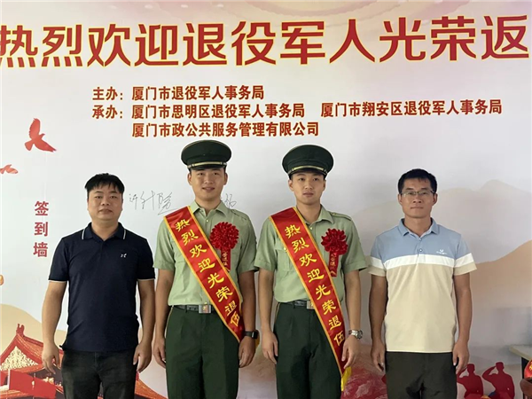 “老兵你好!歡迎回家!”工作人員為退役軍人送上鮮花祝福,并為他們佩戴大紅花和“光榮退伍”綬帶,以飽滿的熱情歡迎他們光榮返鄉,軍屬也紛紛上前與他們熱情相擁。 廈門市 9月1日上午在廈門站,廈門今秋首批退役軍人光榮返鄉。迎接儀式現場,設置“熱烈歡迎退役軍人光榮返鄉”簽到墻,并開設政策解讀專區,貼心的服務受到了返鄉退役軍人的好評。