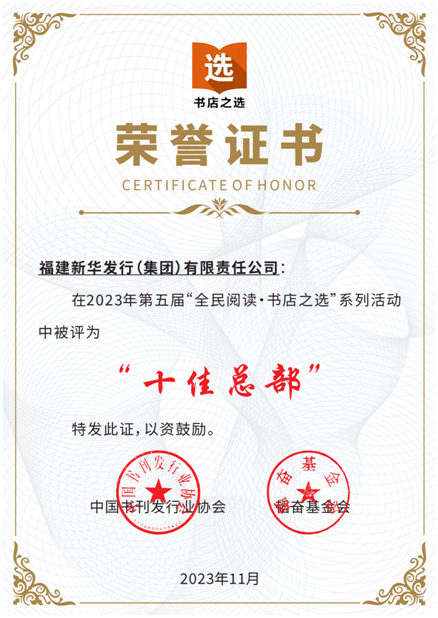 11月10日,在深圳舉行的第五屆“全民閱讀·書店之選”表彰大會暨頒獎儀式上,福建新華發行(集團)有限責任公司被評為“十佳總部”,莆田分公司新華圖書城被評為“十佳組織“、壽寧分公司獲“十佳展陳”、廈門分公司中山·閱埕、福清分公司后埔門店獲“十佳營銷”、南安分公司、柘榮分公司獲“十佳新媒體營銷”。此外,集團還有48家單位榮獲“百佳閱讀推廣單位”獎項。