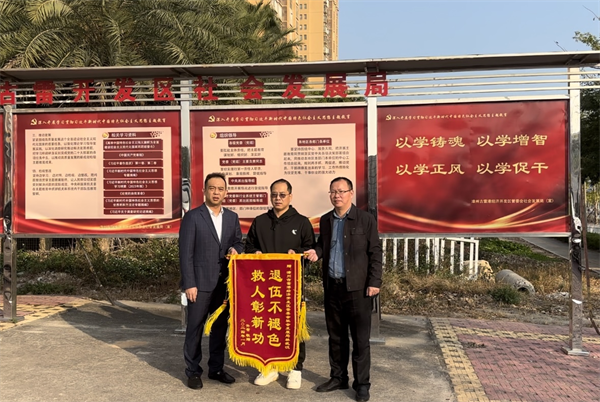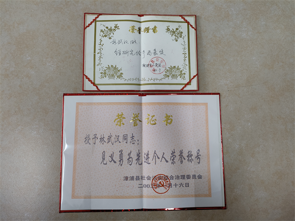 1月3日下午,落水男童的父親(左一)與男童的爺爺到林武漢(左二)的單位送上錦旗表達感恩(右一:林武漢的單位領導) (圖片來源:漳浦縣退役軍人事務局) 至此,一段救人佳話在當地傳開。實際上,林武漢一直是一個熱心助人、和藹心善的“好大哥”。早在2002年上半年某天上午10點左右,家住在漳浦縣醫院家屬院二樓的林武漢,當時剛回到家,就聽到外面傳來“抓小偷!……”的聲音,林武漢果斷跑下樓,看到2位近50歲的醫院聯防隊工作人員在追小偷,29歲的林武漢奮力直追小偷至縣醫院東門對面路邊,才把小偷逮到,并移交公安民警,后經公安局了解到,該小偷是流竄犯。事后,林武漢被當地表彰為“見義勇為先進個人”。 “能幫助到別人,是一件很快樂的事情,能盡自己能力幫他人一個忙,也是一種緣分!”從林武漢口述中可以感受他的樸實和善良。