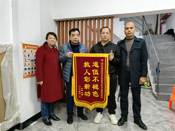 1月2日,落水男童的爺爺奶奶到林武漢(右二)家中送上錦旗表達感恩(圖片來源:漳浦縣退役軍人事務局) 于是,他又調整了一下游泳姿勢,第三次他伺機而動抓住了男童的衣領,往岸邊游去。15時52分34秒,林武漢在水中一手緊緊扣住岸邊石墩縫隙,一手托著男童,在林建云及熱心市民的協助下,男童被成功救上岸。爾后,熱心市民合力將林武漢拉上岸。 雖然男童落水距離岸邊不遠,但由于冬日氣溫驟降、湖面冰冷,林武漢還是費了些力氣才將男童救上岸,站在岸邊石墩上,他不停地喘氣。 “小孩沒事吧,有沒有嗆到水,需要送醫院嗎?”林武漢顧不得自己先向男童的奶奶詢問,得知男童沒什么事,就與林建云默默離開。 正當男童奶奶要向林武漢及其他市民表達謝意時,林武漢和幾位熱心人早已離開現場。奶奶不斷詢問有誰認識剛才救人的好心人,恰巧旁邊有一位認識林武漢的女士告知她說林武漢是一名退役軍人。