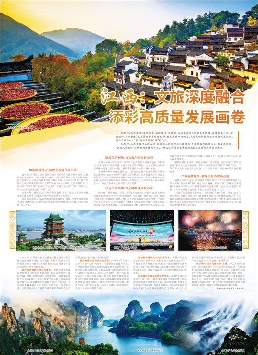 2024年,江西省以“文化強省、旅游強省”為目標,實施文旅深度融合發展戰略,通過政策引領、業態創新、品牌塑造、服務升級等多維度發力,激發文旅市場活力,實現文化底蘊與旅游體驗深度交織,推動文旅產業從“量”的積累邁向“質”的飛躍。 2024年,江西省接待旅游人次、旅游收入均實現雙位數增長,外省游客占比超三成、居全國前列,“江西風景獨好”品牌影響力持續擴大,一幅文旅高質量發展的新圖景正在贛鄱大地徐徐展開。 加強規劃設計,描繪文旅融合新圖景 近年來,江西先后出臺全面推進中國式現代化旅游強省建設、紅色旅游高質量發展、文物主題游徑建設“三項規劃”,制定文旅產業鏈招商、長征國家文化公園江西段重點項目融合發展、藝術創作“四名工程”、書院文化保護傳承發展“四個方案”,實施文旅業態煥新、文旅消費擴容、文博場館“百館晉級”、重點景區“出海”、“非遺點亮生活”江西行動等五大行動,立起文旅融合的“四梁八柱”。 在重大項目建設上,漢代海昏侯國遺址、御窯廠遺址入選國家首批重要大遺址清單,文化遺產保護與旅游開發實現雙贏。 旅游生態優化升級,江西啟動“旅游誠信省”建設,開展優秀旅游服務城市創建試點,著力解決制約文旅市場發展的難點問題,讓“江西口碑”深入人心。 創新保護利用,文化遺產煥發新光彩 非遺文化融入居民生活。江西依托全省各地非遺保護機構、保護單位、非遺傳承人,創新實施“非遺點亮生活”江西行動,讓豐富多彩的年俗活動隨處可見,讓剪紙、花燈、舞獅等非遺代表性項目隨時體驗。 文物保護利用取得顯著成效。江西制定加強書院文化保護傳承發展實施方案,建立文物保護公益訴訟協作機制。扎實推進第四次全國文物普查,“三普”文物復查率100%,進度居全國前列。革命文物保護出新出彩,成功創建井岡山革命博物館—江西師范大學國家革命文物協同研究中心,推出首批革命文物保護利用示范縣。 打造文旅品牌,擦亮贛鄱風景新名片 國內推廣精準觸達。“樂游江西”國內文旅推廣計劃實施,省市聯動赴重要客源地舉辦70余場“如畫江西 風景獨好”宣傳推廣活動,推出“風景獨好”主題游輪、高鐵、飛機、巴士。“百名香港校長看內地——江西歷史文化之旅”、“江西風景獨好”港澳文化和旅游宣傳推廣月等系列活動開展,“江西風景獨好”江西文旅(香港、澳門)宣傳推廣中心成立。江西聯合故宮推出“御瓷歸來”特展,外省觀眾近七成,觀眾過百萬人次,成為現象級展覽。 國際傳播擴大聲量。海外文旅推廣計劃實施,成功舉辦“江西風景獨好”東南亞文化和旅游推廣季啟動儀式暨馬來西亞“江西日”活動。江西召開文化和旅游全球發布會,11個設區市共計推出546項旅游優惠政策。 產業提質升級,激發文旅消費新動能 消費市場活力迸發。江西創新開展江西“三百”文旅消費季等活動,深入實施“引客入贛”工程,推出“龍行龘龘樂游江西”“全球學子嘉游贛·背誦詩詞江西GO”門票減免等系列優惠政策。2024年,全省累計開展1.7萬余項特色文旅活動,發放文旅消費券近1.5億元。 “文旅+”業態創新場景豐富。江西推進“文旅+百業”“百業+文旅”,策劃推出“跟著詩詞游江西”“跟著賽事游江西”“跟著演出游江西”等主題活動;環鄱陽湖國際自行車大賽、新余仙女湖馬拉松賽、武功山頂星空派對等成為市場新熱點。“唱游江西”群星薈萃,千場演唱會、音樂節讓省外游客“跟著音樂游江西”。 2025年,江西省文旅系統將繼續錨定建設中國式現代化旅游強省目標,改革創新,真抓實干,推動文化和旅游更深層次融合、更高質量發展,奮力譜寫中國式現代化江西實踐新篇章。 著力構建贛鄱文化標識體系。加快推進景德鎮國家陶瓷文化傳承創新試驗區、長江國家文化公園(江西段)建設,加快推進長征國家文化公園建設項目轉化利用,編制出臺《長江國家文化公園江西段建設保護規劃》。實施贛鄱文化闡釋工程,讓江西詩派、江西畫派等贛鄱特色文化煥發時代新光彩。推進考古遺址公園建設提升、古村落古建筑和江西書院的活化利用,推出一批特色文旅“新贛線”。 持續推進文旅深度融合發展。持續做好“文旅+百業”“百業+文旅”大文章。實施景區業態提升計劃,引導旅游景區豐富業態供給,提供更多旅游場景。實施文旅品牌培育計劃、文旅業態融合計劃,持續開展“風景獨好”旅游名縣、名景區、名鎮村“三名”評選,指導廬山、三清山等重點景區培育創建世界級旅游景區、世界級旅游度假區,指導景德鎮陶陽里等景區創建國家5A級旅游景區。擦亮江西紅色研學品牌。推進“云游江西”數字文旅一體化平臺建設,創新數字技術助力文旅發展提質升級。 加快構建現代化文旅產業體系。開展頭部文旅企業招商對接活動,引進和落地一批重大文旅項目。實施文旅消費聚能計劃,創新舉辦文旅消費季等重大活動,打造一批特色明顯、文旅融合的步行街、綜合體、美食店等,培育首屆江西十大文旅消費新場景、新業態。 扎實做好非遺系統性保護傳承。深耕“非遺點亮生活”江西行動,打造江西非遺保護傳承品牌。加快推進江西省非遺館建設立項。推進國家級、省級文化生態保護(實驗)區、非遺工坊建設。推動非遺與旅游融合發展,大力開展非遺進景區、進街區、進社區,