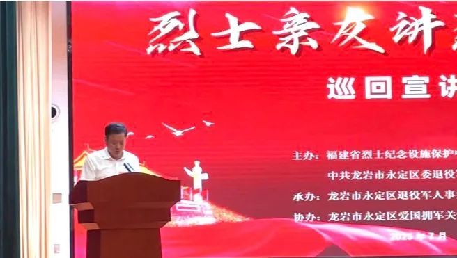 為紀(jì)念中國(guó)人民抗日戰(zhàn)爭(zhēng)暨世界反法西斯戰(zhàn)爭(zhēng)勝利80周年,7月28日晚上,福建省“烈士親友講烈士故事”巡回宣講(永定專場(chǎng))活動(dòng)在永定科技館禮堂隆重舉行。龍巖市、永定區(qū)有關(guān)領(lǐng)導(dǎo),區(qū)退役軍人事務(wù)局全體干部職工、區(qū)愛國(guó)擁軍關(guān)愛退役軍人協(xié)會(huì)、各鄉(xiāng)鎮(zhèn)(街道)退役軍人服務(wù)站站長(zhǎng)、駐永部隊(duì)官兵代表、公檢法干警代表、學(xué)生代表、退役軍人代表、先進(jìn)模范代表近500人參加。