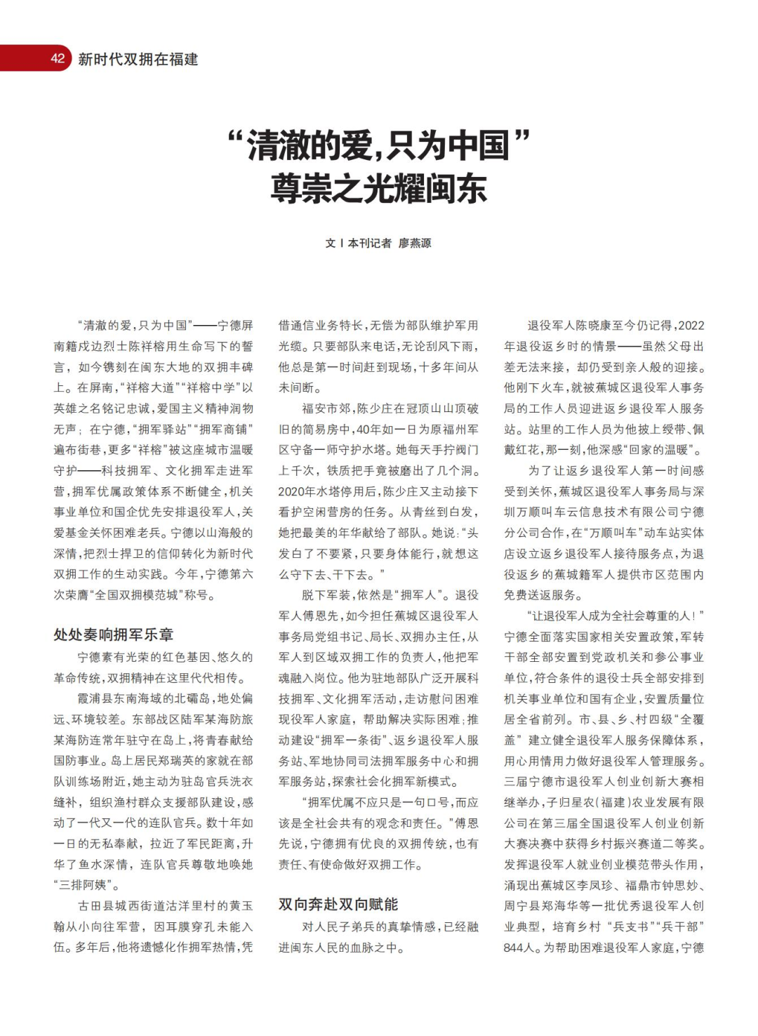 編者按 在福建這片紅色熱土上,“軍愛民、民擁軍”的光榮傳統源遠流長,根深葉茂。全省軍地各級深入學習貫徹習近平總書記關于雙擁工作的重要論述,始終秉承“愛我人民愛我軍”的雙擁優良傳統,創新推進軍民共建、軍地互辦實事、精準服務退役軍人等機制,高質量服務支前備戰,擁軍優屬富有成效,雙擁文化氛圍濃厚,涌現出一大批全國雙擁模范城(縣),圓滿實現全國雙擁模范城“滿堂紅”“六連冠”,成為全國唯一獲此殊榮的省份。 《海峽通訊》推出“新時代雙擁在福建”專欄,集中報道我省各地開展雙擁工作的好經驗、好做法、好故事,推動福建雙擁工作高質量發展不斷取得新突破,今日轉載《“清澈的愛,只為中國” 尊崇之光耀閩東》,全文如下。 “清澈的愛,只為中國” 尊崇之光耀閩東 文|廖燕源