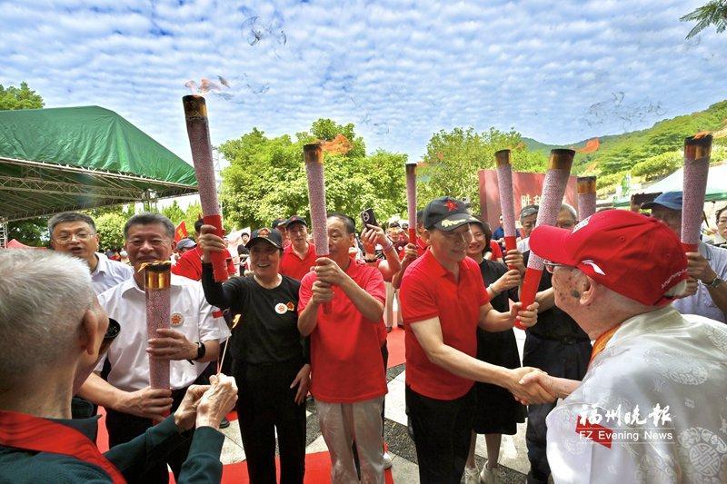 101歲的陳世明和97歲的姜汝煥引出火種,為9位抗日志士后人點燃火炬。 追憶往昔 話傳承使命 歷史的記憶需要實體的承載,精神的傳承需要后人的接續。 福建省政協副秘書長、臺盟福建省委會專職副主委許勇鐵代表活動主辦方在致辭中說:“偉大的抗戰精神,是中國人民彌足珍貴的精神財富,更是兩岸同胞共同的歷史記憶與精神紐帶。” 老紅軍、抗戰時期八路軍120師排長王玉清之子王寧表示:“兩年前,103歲的父親謝世。去世時,他唯一的遺憾是沒有看到兩岸統一。作為兒子,我覺得對父親最好的告慰,就是傳承紅色基因,繼承和發揚革命精神。兩岸統一那天,我一定會到這里告慰九泉之下的父親,這是他最想聽到的好消息,實現中華民族偉大復興是父親一生奮斗的目標。” “抗戰時期,旅居菲律賓的愛國華僑以捐款、捐飛機、組團回國參戰等實際行動積極支持祖國的抗日戰爭,并且成立了唯一的一支海外抗日武裝——菲律賓華僑抗日游擊支隊,與菲律賓人民并肩打擊日本侵略者……”菲律賓華僑抗日游擊支隊第五大隊指導員郭鋼之子郭建安作為海外華僑抗日志士后人代表發言,講述先輩們的熱血故事,展現了海外僑胞的家國情懷和國際主義精神。 “抗戰勝利,臺灣光復;山河同氣,永續傳承?!碑斕?,臺灣抗日志士后人與大陸創作者聯合手書的作品寄至現場,并捐贈給三山人文紀念園收藏。臺灣著名詩人、書法家陳志聲創作的詩詞也同步捐贈。