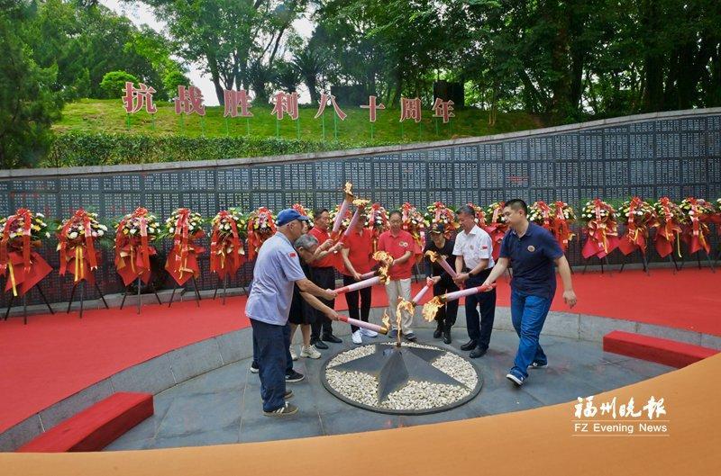 社會各界人士敬獻鮮花。 深切緬懷 燃傳承火種 佩戴起特制的抗戰勝利80周年紀念徽章,在紀念墻上鄭重簽名,與采集來的火種合影留念……8月31日8時許,福州抗日志士紀念墻前已是人頭攢動,早早來到這里的人們,以各種方式表達崇敬之情。 凝視福州抗日志士紀念墻,墻上8564個名字熠熠生輝,每一個名字背后,都是一位在民族危亡之際挺身而出的抗日志士,都有著一段可歌可泣的英雄故事?!拔腋赣H是抗日志士鄭其土。”鄭方干在父親名字旁貼上小小的五星紅旗,“這是告慰先人的一種方式,我們沒有忘記他們,大家都沒忘記他們!”記者看到,許多抗日志士姓名旁都貼上了小小的五星紅旗。 戴著紀念徽章的兩位抗日志士——97歲姜汝煥和101歲陳世明的到來,吸引了眾人的目光?!昂芨吲d,看到很多熟人?!标愂烂餍呛堑啬贸鲈缫褜懞玫膬蓮堉杏⑽念}字贈與福建省閩浙贛邊區革命史研究會會長凌冰。一張寫著“大力弘揚偉大抗戰精神”,一張寫著“銘記歷史 緬懷先烈”,這是老人對后輩的諄諄囑托。 9時03分,穿透時空的號角聲響起。這號角,是告慰,亦是召喚,喚醒人們共同的歷史記憶?!皠倮??和平——紀念中國人民抗日戰爭暨世界反法西斯戰爭勝利80周年活動”在號角聲中拉開帷幕。隨后,全場肅立,《義勇軍進行曲》的激昂旋律回蕩在紀念園上空,嘉賓們向福州抗日志士紀念墻行注目禮,用最莊重的方式致敬英烈。 活動現場,工作人員向抗日志士姜汝煥和陳世明獻花;主辦方及參與單位代表向紀念墻敬獻花籃并整理綬帶。朵朵鮮花寄托哀思,條條綬帶承載敬意,訴說著后人們對前輩先烈的深切緬懷。 抗戰的精神需要薪火相傳?,F場大屏幕上播放的“薪火八閩”采集視頻,帶領大家回顧1個月來的火種采集歷程——從福州八一七烈士墓到福建省閩浙贛邊區革命紀念碑、福建省閩粵贛邊區革命紀念碑,從閩侯大湖抗戰遺址到陳紹寬上將故居、福州解放紀念碑、福州長江支隊紀念園,每一處都是一段悲壯史詩,每一簇火苗都是一粒不滅的精神種子。 在眾人注視下,抗日志士姜汝煥和陳世明從火種臺引出火種,并為9位抗日志士后人點燃火炬,再由他們共同執火炬點燃“抗戰精神傳承長明火”。跳躍的火焰升騰而起,象征著無數抗日志士用鮮血和犧牲鑄就的抗戰精神將在一代又一代后人手中永續傳承、永不熄滅。