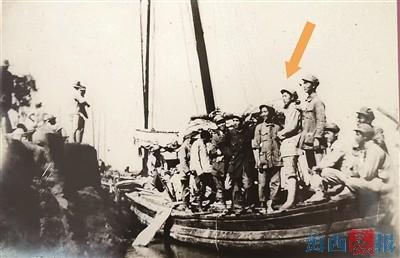渡江戰役期間,陳榮珠(箭頭指向者)站在船頭。受訪者供圖