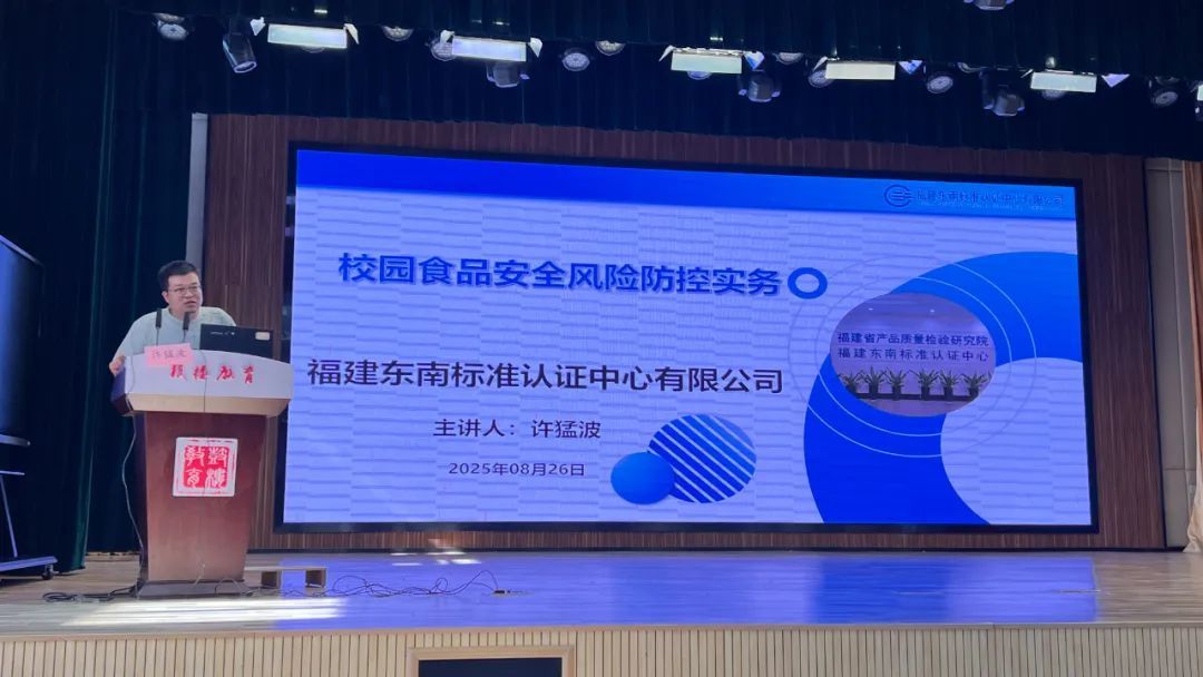 福建東南標準認證中心許猛波以《聚焦校園食品安全風險,筑牢師生健康防線》為題,圍繞食品采購儲存、加工制作規范、衛生標準把控等內容進行講解,結合典型案例與圖片深入淺出地剖析食品安全風險點;強調食材采購查驗、餐用具消毒、食品留樣等規范,針對食品儲存、冷鏈管控、標簽不規范等問題提出防控要點。同時,還解讀相關法律法規與主體責任要求,為校園食品安全管理提供實操指引。