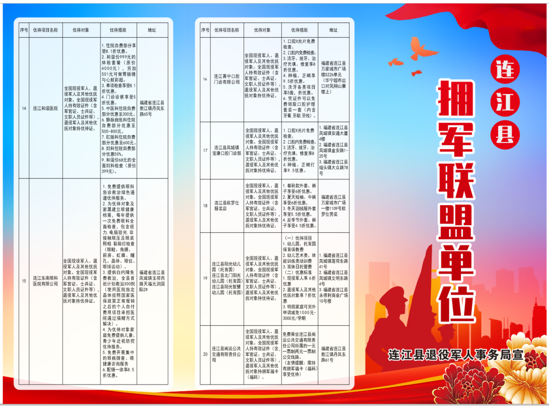 “擁軍大聯盟”單位優待項目(部分) 根據協議內容,“擁軍大聯盟”各成員單位將立足自身行業特點和資源優勢,聚焦現役軍人、退役軍人及家屬的實際需求,在文旅、教育、醫療、餐飲等多個民生領域精準提供 “三優服務”(優質產品、優先待遇、優惠價格),以實打實的優惠來增強軍人軍屬、退役軍人的榮譽感、獲得感與幸福感。自2024年5月連江“擁軍大聯盟”成立以來,社會各界響應熱烈,截至目前,已有24家企業踴躍加入,聯盟的社會影響力與服務覆蓋面持續擴大。 “我們深耕家庭教育領域多年,始終心懷對軍人的敬意,希望通過專業服務為軍人家庭提供更有力的教育支持。”連江行知教育咨詢服務部主理人邵文慧表示 “我十分崇拜軍人,所以這次能加入‘擁軍大聯盟’既喜悅又榮幸。”連江興達汽車培訓有限公司董事長李章財表示,他們計劃為全國現役軍人、退役軍人及其他優撫對象提供駕校培訓8.5折的專屬優惠。 為現役軍人家庭送去立功喜報