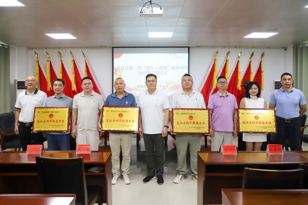 活動現場,連江縣退役軍人事務局與福州億聯鑫汽車服務有限公司、連江興達汽車培訓有限公司、福州龍強貿易有限公司、連江行知教育咨詢服務部、連江和諧醫院(僅簽訂補充協議)5家企業簽訂“擁軍聯盟”合作協議書,并進行授牌。