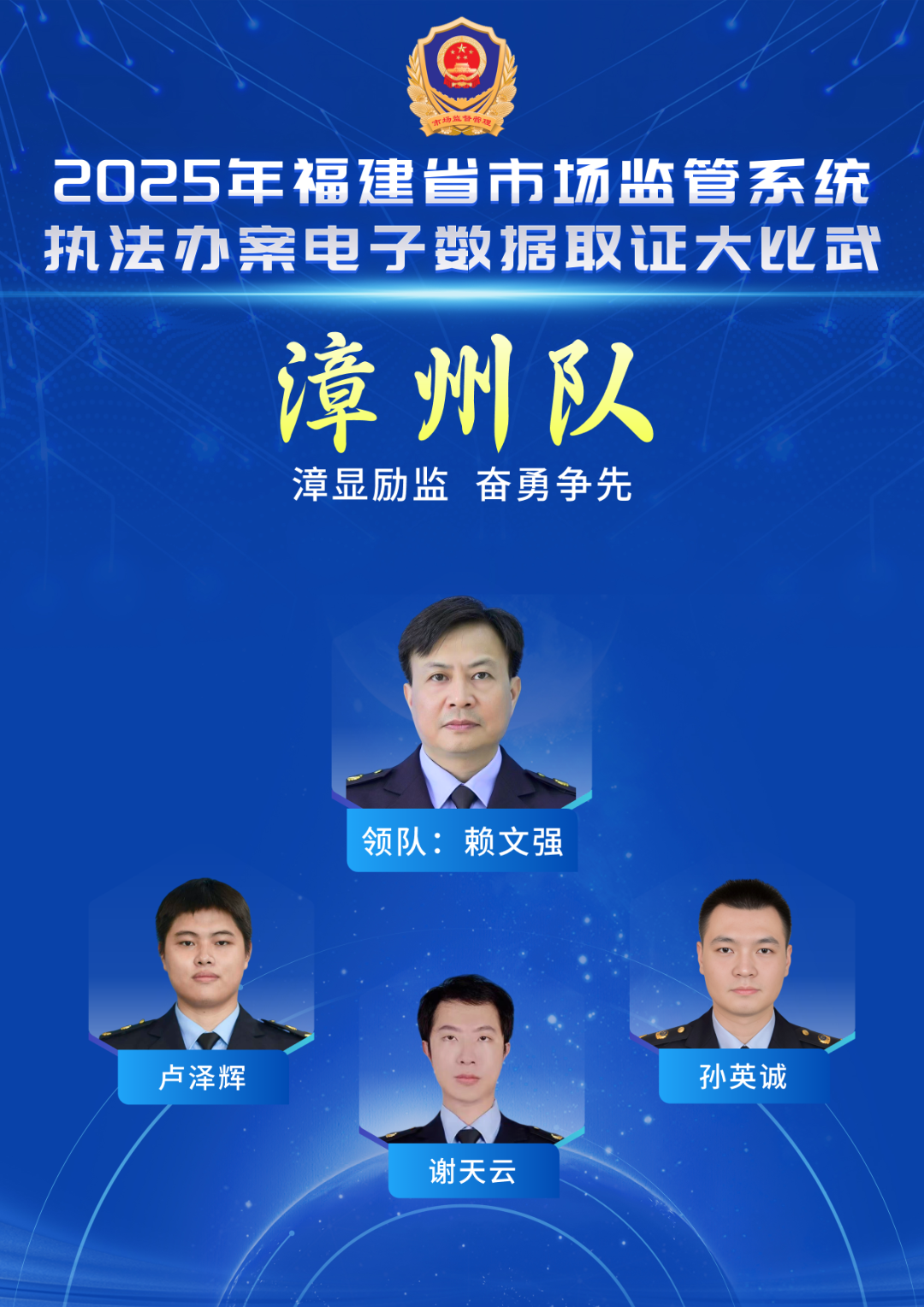 口號:廈門市監,一鷺爭先 成員簡介 洪志新(領隊),廈門市市場監管局黨組成員、副局長、市知識產權局局長。 沈瑋煌,男,現任廈門市思明區市場監管局鼓浪嶼市場監管所四級主任科員。從事市場監管工作4年。先后在注冊、執法、監管等多個崗位工作,有多年的基層監管執法經驗。2021年參加首屆福建省市場監管系統執法辦案電子數據取證大比武,獲團體一等獎、個人二等獎;2023年參加福建省市場監管系統執法辦案電子數據取證大比武,獲團體銀獎、個人銀獎。 林楨,女,現任廈門市翔安區市場監管局執法稽查科一級科員,從事市場監管工作2年。主要從事基層執法辦案,獲2024年參加福建省市場監管系統執法稽查職業技能競賽團體金獎。 謝瑋銘,男,現任廈門市思明區市場監管局執法稽查科一級科員,從事市場監管工作2年。主要從事基層執法辦案。 漳州代表隊