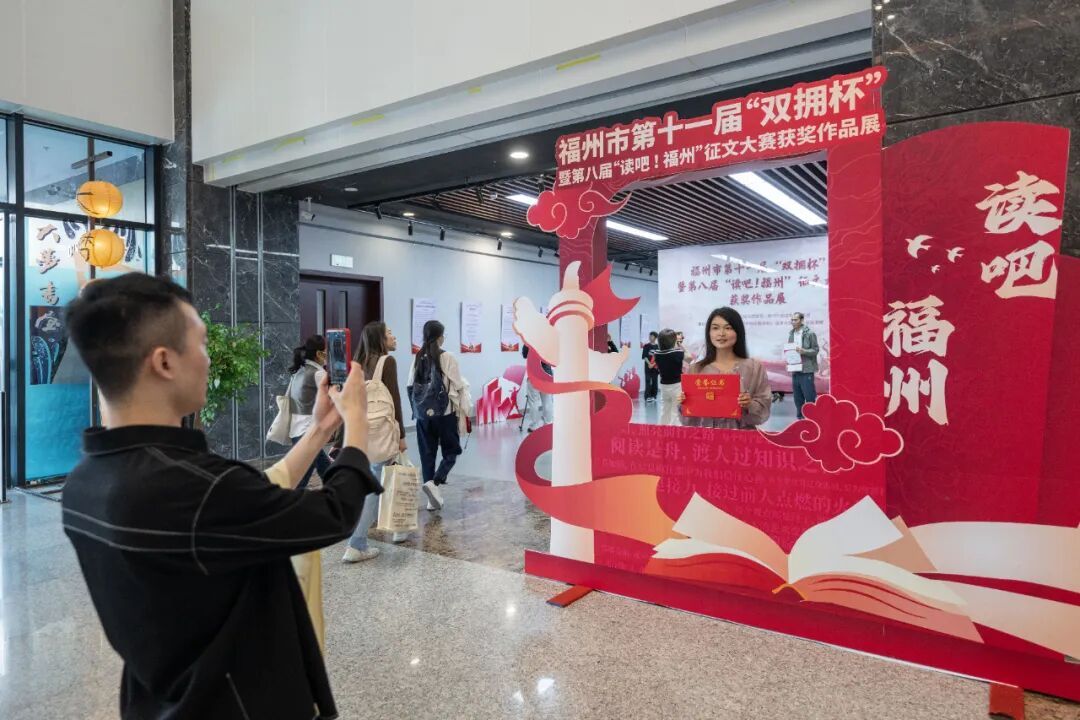 在征文大賽獲獎作品展現場,一名獲獎者拍照留念。 本屆征文活動于6月至8月面向全市軍民征稿,引發熱烈反響。各縣(市)區圖書館、駐榕部隊及學校等單位積極組織,各界人士踴躍投稿。至8月31日截稿時,共征集作品近400篇。經初賽篩選和專家評審,最終評選出獲獎作品40篇,6個單位榮獲大賽組織獎。 40篇獲獎作品中,20篇獲“書香滿榕城 閱動新時代”主題一、二、三等獎,其中成人組10篇,青少年組10篇。創作者不約而同地關注到如何將閱讀作為生活方式和精神追求、如何因閱讀成長、如何見證并參與新時代發展等主題,展現了個人與城市、時代共同進步的歷程,描繪出新時代福州豐富多元的文化發展藍圖,體現了閱讀對城市發展的推動作用。 另外20篇“雙擁耀榕城 軍民譜新篇”主題獲獎作品(成人組、青少年組各10篇),回顧了福州雙擁模范城“十連冠”歷程,講述了創建中的新人新事,謳歌了先進典型與感人事跡,描繪了軍地共建成果與軍民魚水深情,彰顯了軍民團結的磅礴力量。