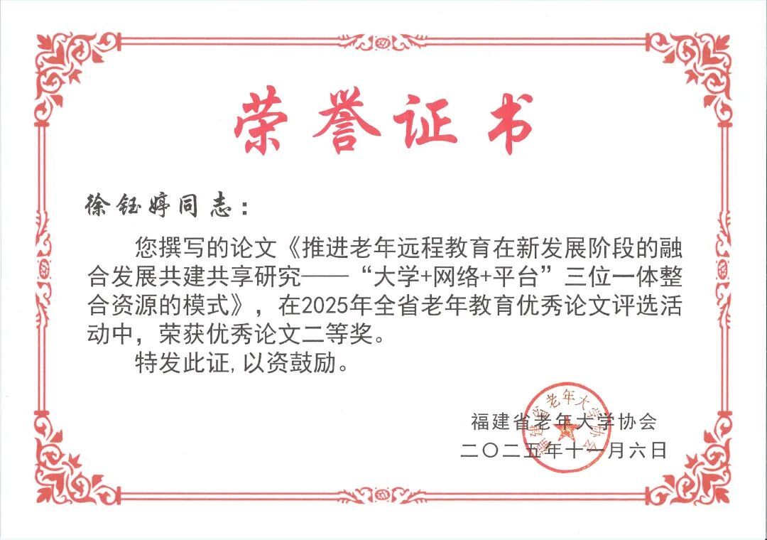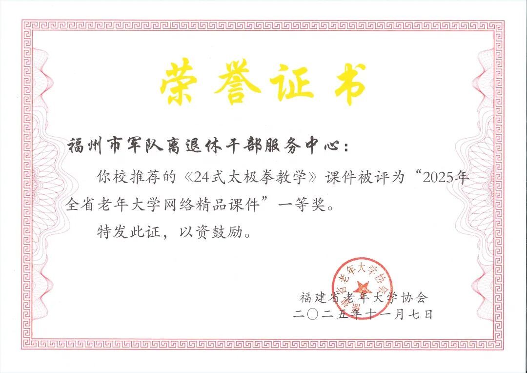 近日,全省老年教育工作會議在南平召開,表彰2025年全省老年教育優秀成果。福州市軍休老年大學選送的《24式太極拳教學》榮獲“2025年全省老年大學網絡精品課件”一等獎;軍休老年大學工作人員徐鈺婷撰寫的論文《推進老年遠程教育在新發展階段的融合發展共建共享研究——“大學+網絡+平臺”三位一體整合資源的模式》獲評“2025年全省老年教育優秀論文”二等獎。
