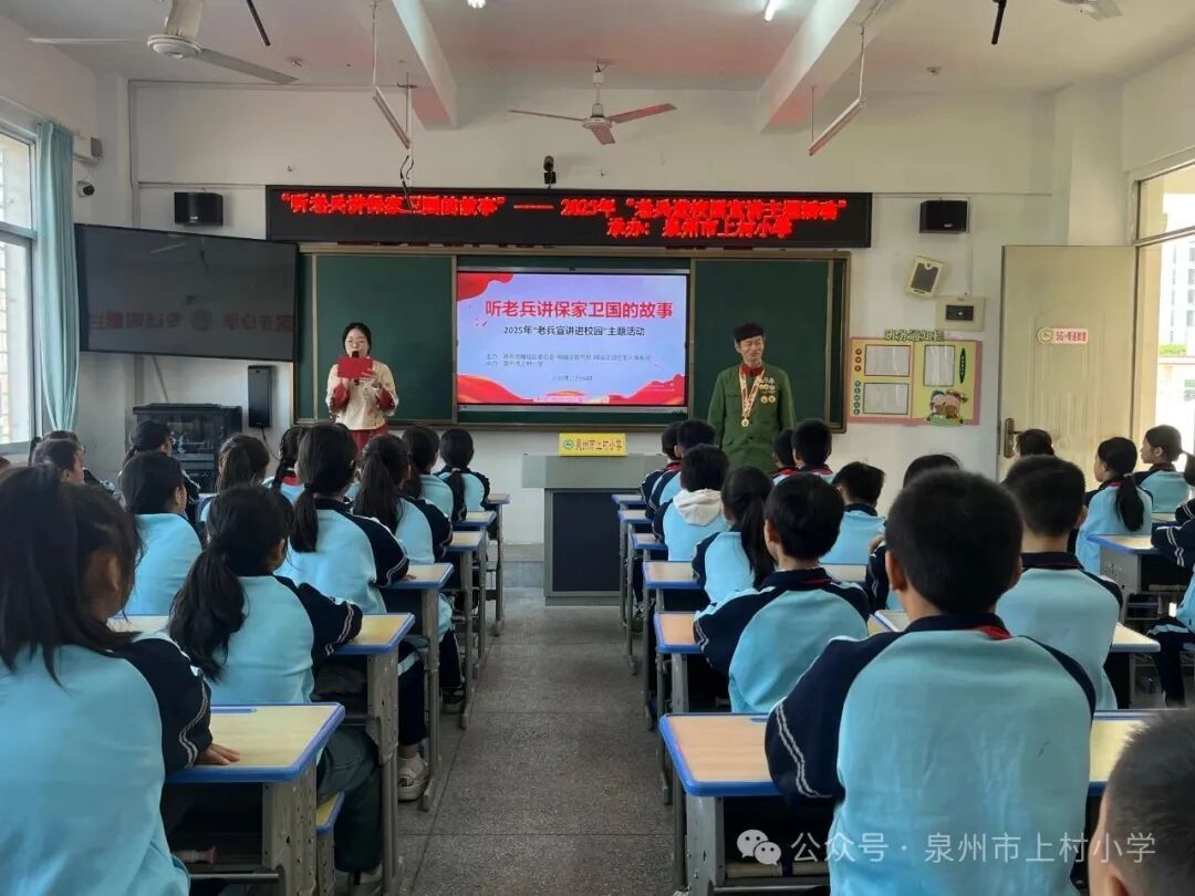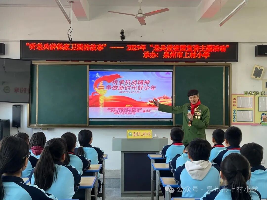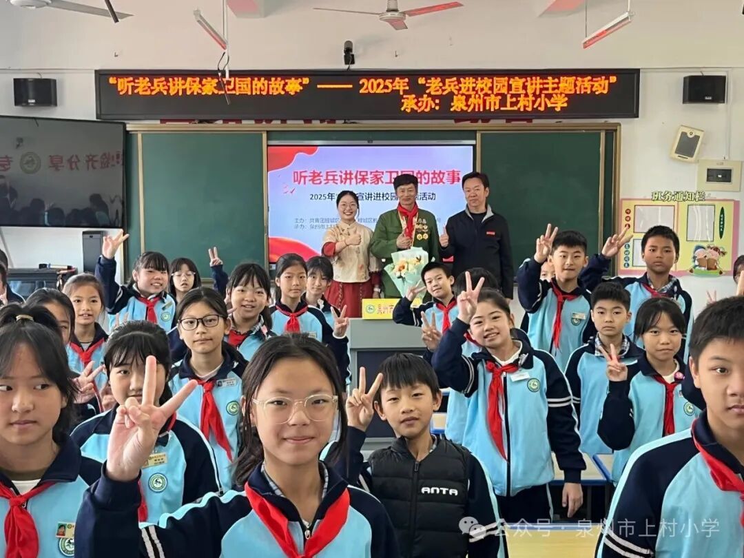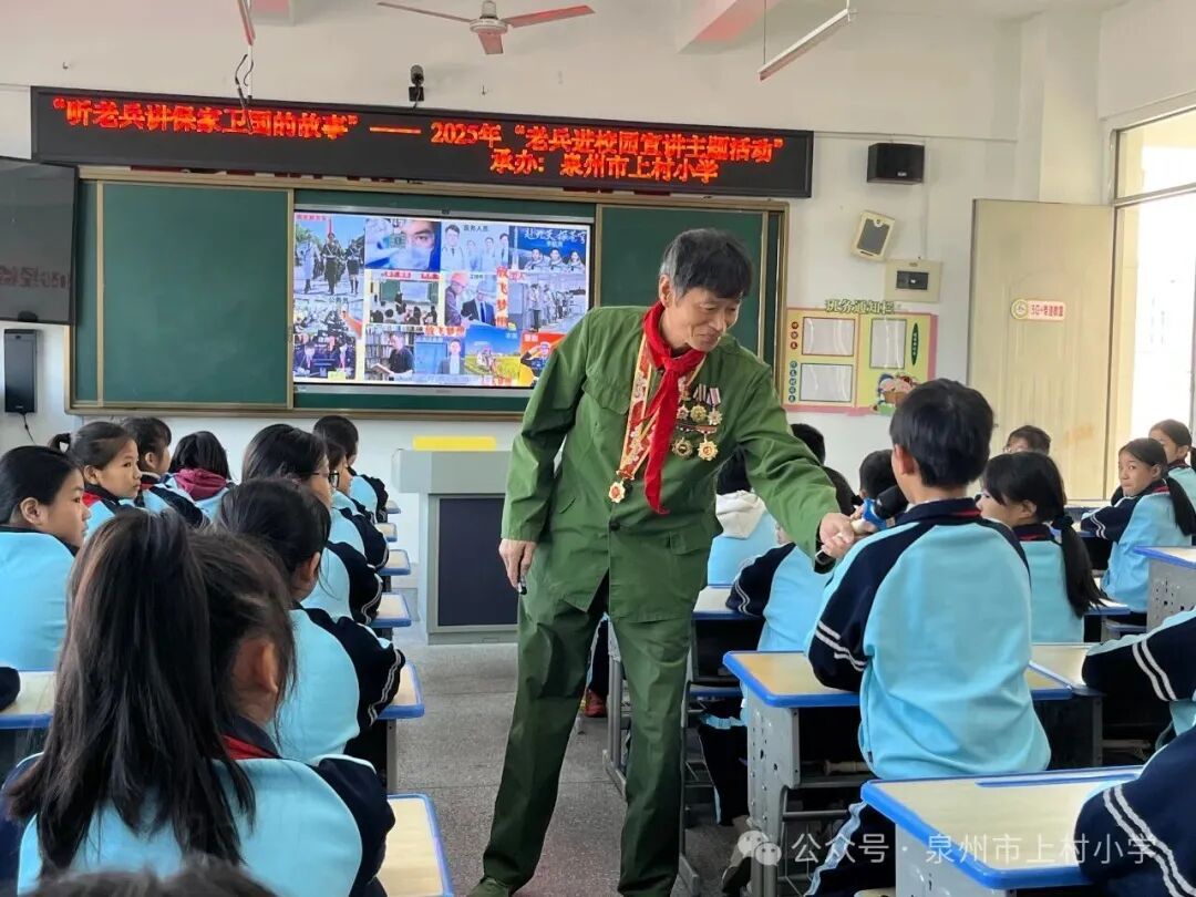 11月26日上午,一等戰功獲得者、“泉州市最美退役軍人”詹明德走進泉州市上村小學開展主題宣講。此次活動由共青團鯉城區委員會、鯉城區教育局、鯉城區退役軍人事務局主辦,泉州市上村小學承辦。少先隊員們與輔導員懷著無比崇敬的心情歡聚一堂,共同聆聽戰斗英雄的傳奇故事,感受退役軍人的初心使命。現場響起的陣陣熱烈掌聲,是大家對他最誠摯的問候與最崇高的敬意。 活動現場,輔導員帶領大家共同回顧了一等戰功獲得者、“泉州市最美退役軍人”詹明德那部書寫著忠誠與擔當的壯麗人生篇章。他始終堅守軍人本色,恪盡職守、銳意進取,先后斬獲省級勞模、市精神文明建設先進工作者、市見義勇為先進個人、市五一勞動獎章、區優秀共產黨員等省、市、區各級榮譽近三十項,用實際行動踐行了“為人民服務”的錚錚誓言。