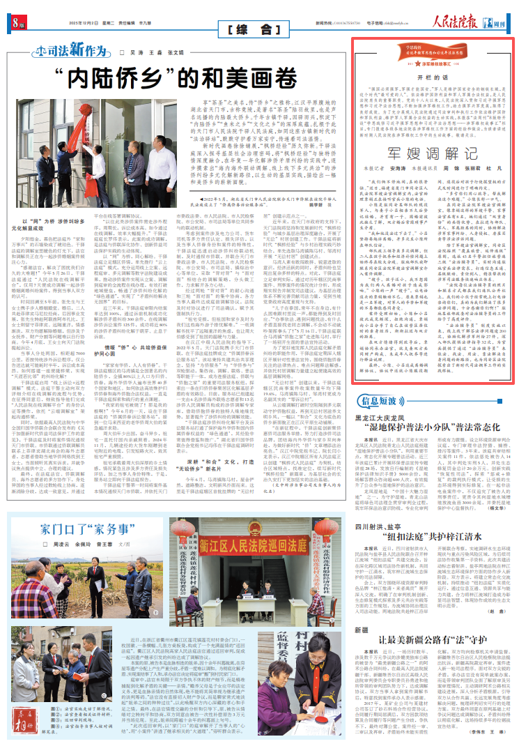 編者按:近日,《人民法院報》“學(xué)思踐悟習(xí)近平強軍思想和習(xí)近平法治思想——涉軍維權(quán)故事匯”欄目,報道廈門市同安區(qū)人民法院成立法院軍嫂法官調(diào)解室,積極推行“法治輔導(dǎo)員”制度,用法治力量保障官兵合法權(quán)益的暖心實踐。請看報道——