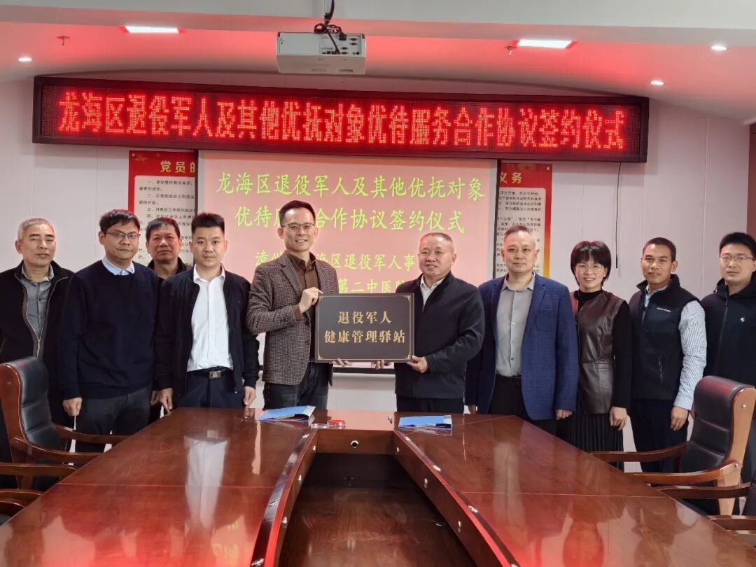 近日,漳州市龍海區退役軍人事務局與漳州市第二中醫院舉行合作協議簽約暨“退役軍人健康管理驛站”授牌儀式,標志著龍海區“中醫+擁軍”特色服務模式正式落地,讓優撫對象在家門口就能享受到優質便捷的健康保障。 作為落實退役軍人服務保障政策的重要實踐,“退役軍人健康管理驛站”的成立是龍海區聚焦退役軍人核心健康需求的生動探索。經過多輪調研對接,龍海區退役軍人事務局與醫療資源雄厚、健康管理經驗豐富的漳州市第二中醫院達成合作,驛站以“尊崇軍人、關愛健康”為理念,整合雙方優勢構建起“預防-診療-康復-保障”全鏈條健康服務體系。