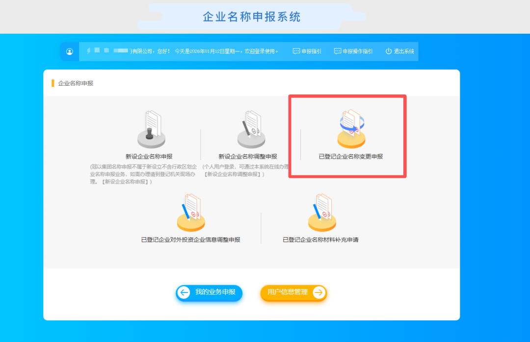 3.登錄成功后,在頁面選擇“已登記企業名稱變更申報”模塊。