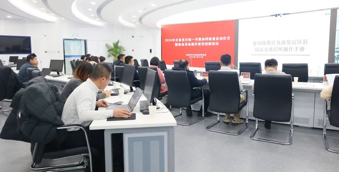 2026年1月21日,全省首次統一開展協同檢查啟動儀式暨檢查系統操作使用視頻培訓在省市場監管局23樓智慧監管指揮中心舉辦。會議深入貫徹落實黨的二十屆四中全會和省委十一屆九次全會精神,緊扣全國、全省市場監管工作會議部署要求,組織抽取2026年上半年全省協同檢查對象名單,部署全年協同檢查工作,正式啟動2026年上半年全省協同檢查。省市場監管局黨組成員、副局長王文生出席會議并講話。