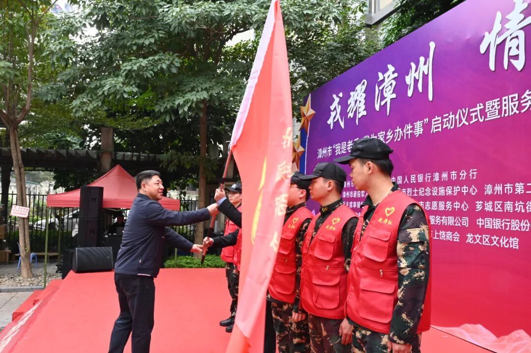 隨后,授牌授旗儀式隆重舉行。漳州市退役軍人事務局黨組成員、副局長宋克勤先后為漳州理工職業學院、漳州市三和律師事務所等8家新成立的退役軍人服務站授牌,進一步拓寬擁軍服務網絡,并為“戎漳紅”志愿服務隊授旗。 “授旗是鼓舞,接旗是承諾!我們一定踐行志愿精神,為家鄉多辦實事。”志愿服務隊隊員們精神抖擻,堅定的誓言贏得陣陣掌聲。