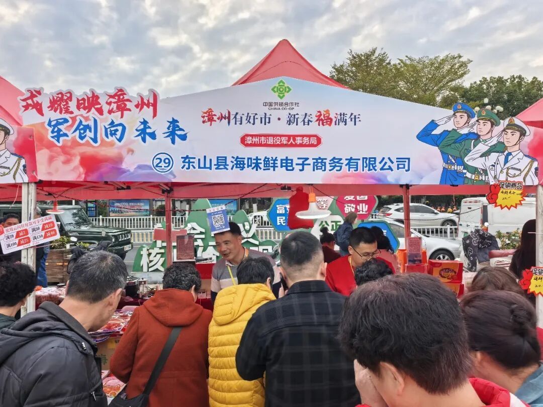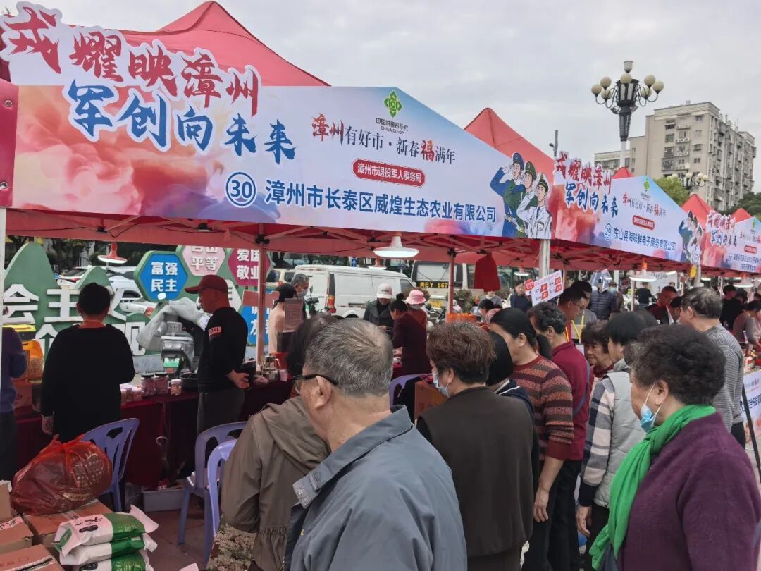 現場共設有70個展位,集中展示了漳州各縣區的名特優農產品,吸引眾多市民前來選購。本次年貨節的一大亮點,是首次設立的“戎耀映漳州·軍創向未來”退役軍人創業專區,該專區由漳州市退役軍人事務局精心遴選5家優質軍創企業參展,成為活動現場一道獨特的風景線。