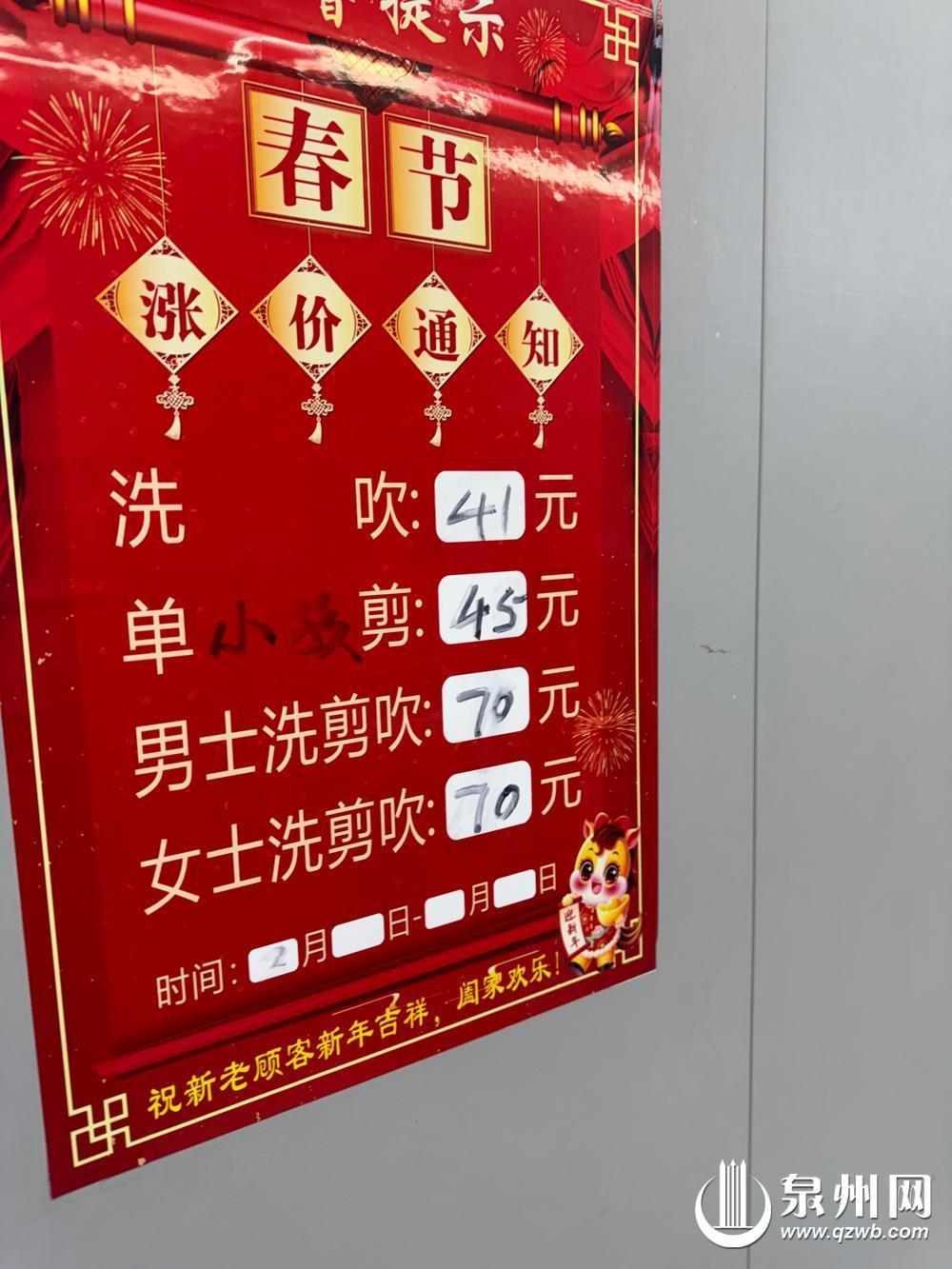 服務行業(yè)節(jié)前價格普漲引關注 部門:應明碼標價,保障消費者知情權和選擇權 泉州網2月10日訊(融媒體記者 廖培煌 楊泳紅 宋萬春 文/圖)春節(jié)臨近,理發(fā)、洗車、家政等服務行業(yè)迎來消費旺季,部分商家依據市場情況上調服務價格,此現象成為年關消費熱點話題。在市場供需變化下,價格合理浮動本是正常市場調節(jié),但若缺乏透明度與合理性,可能影響消費信任。 泉州市市場監(jiān)督管理局重申,經營者應嚴格落實明碼標價規(guī)定,依法保障消費者知情權和選擇權。廣大群眾若遇價格糾紛或發(fā)現價格違法行為,可撥打“12315”或向屬地市場監(jiān)管部門投訴舉報。 走訪 多行業(yè)普遍漲價 個別漲幅翻倍 連日來,記者走訪發(fā)現,臨近春節(jié),多個行業(yè)服務價格出現不同程度上漲,個別行業(yè)漲幅相對較大,甚至翻倍。