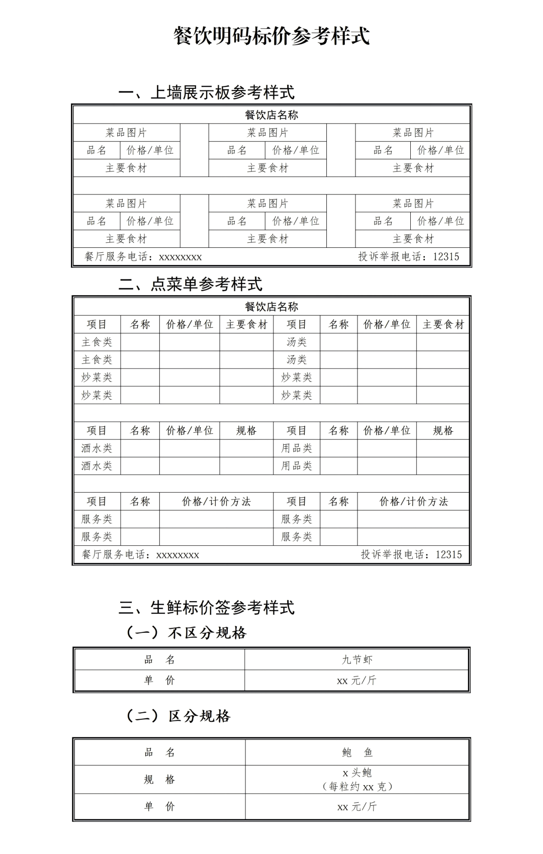 根據《中華人民共和國價格法》《明碼標價和禁止價格欺詐規定》《中華人民共和國消費者權益保護法》《餐飲業促進和經營管理辦法》等法律法規和國家有關規定梳理形成本指引,供各餐飲經營者參考使用。 餐飲收費“十標清”指引 一、收費標準要標清。 餐飲經營者應通過價目表、點菜單、展示板或點菜小程序等方式,清晰完整地公示所有盤菜、套餐、主食等菜品和酒水、紙巾等商品用品以及加工、打包、外送等服務的收費單價和計價單位。 二、主要食材要標清。 餐飲經營者應在經營場所醒目位置,對各式菜品的主要食材予以明確標示。如“砂鍋牛腩(主要食材:牛腩、蘿卜)”。 三、時令菜價要標清。 餐飲經營者應當及時更新時令菜品價格信息,并在大廳、點菜區等顯著位置通過價目表、電子屏等方式公示海鮮、蔬菜、瓜果等時令菜品的最新價格。 四、食材屬性要標清。 對價格較高或容易引發爭議的特殊食材,餐飲經營者應當特別備注其產地、養殖方式、品級等屬性。如標注“甲魚(野生)”“大閘蟹(產地:陽澄湖)”。 五、加工費用要標清。 如需對生鮮菜品加收烹飪加工費的,餐飲經營者應分別標明生鮮食材價格和加工費用。如“小青龍XX元/斤,避風塘風味加工費XX元/份”。 六、額外費用要標清。 在菜金之外,如需加收服務費、茶水費以及一次性消毒餐具、紙巾等費用的,餐飲經營者應在價目表、點菜單等醒目位置逐一標明收費標準,并在消費者點餐時主動告知。 七、套餐內容要標清。 提供年夜飯、旅游團餐等套餐的,餐飲經營者應標明套餐價格,并逐一列明套餐所含的菜品、商品、用品的名稱、份量、適用人數及相關服務內容,同時標明是否加收服務費、茶水費等其他收費。 八、外賣價格要標清。 通過網絡平臺提供外賣服務的,餐飲經營者應在平臺頁面清晰公示菜品、飲品、商品、用品的價格、份量,以及打包、配送等服務收費標準。 九、價格優惠要標清。 開展降價、打折、團購套餐等促銷活動時,餐飲經營者應在經營場所或網絡平臺醒目位置標明優惠菜品、優惠價格、優惠期限、優惠條件、使用限制等詳細信息。 十、服務熱線要標清。 餐飲經營者應當在經營場所顯著位置標明服務電話和投訴舉報渠道,方便顧客及時反映價格、服務等相關訴求。 餐飲收費“十不得”指引 一、不得使用品名、價格、計價單位標示不清的價目表、點菜單,或使用“時價”“面議”等模糊表述規避明碼標價義務。 二、不得在公示的菜品和酒水等商品價格及服務收費標價之外,加價收取菜金、出售商品或者提供服務。 三、不得收取任何未予標明的服務費、茶水費、廚余垃圾處理費以及一次性消毒餐具、紙巾等各類費用。 四、不得通過不標示、模糊標示或以細小字體、隱蔽位置等顯著弱化方式,標示對消費者不利的價格條件。 五、不得使用具有欺騙性、誤導性的菜品圖片、視頻等媒介標示價格相關信息,誘騙消費者進行消費。 六、不得采取“陰陽菜單”“兩套價格”“低標高結”等不正當價格手段欺詐消費者。 七、不得設定任何形式的最低消費金額,包括通過包間費、指定套餐等變相方式設定最低消費。 八、不得在消費者核銷團購優惠券等憑證時,臨時增設使用條件或限制使用范圍,變相提高消費價格。 九、不得在未經消費者同意的情況下,擅自降低已承諾提供的菜品質量或服務標準。 十、不得在節假日、旅游旺季等重要時段,利用市場供需緊張狀況,坐地起價、跟風漲價、哄抬價格,擾亂市場秩序。